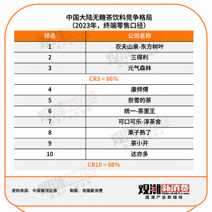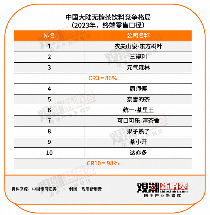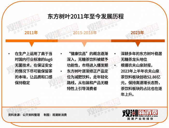 这期间,率先出击的统一茶里王在历经7年的坚守后于2011年折戟退场。同年,农夫山泉从统一手中接下了行业的接力棒,推出品牌「东方树叶」,最终成为了无糖茶的中坚力量。