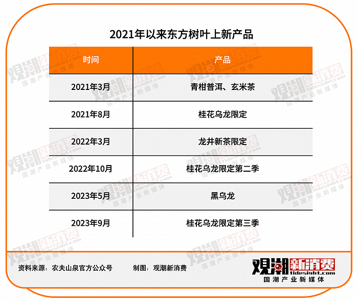 今年5月,东方树叶产品阵营再添一员——黑乌龙。这款新产品添加福建特级乌龙茶,并放大了“岩骨·花香”的特点介绍。自此,东方树叶共有7款固定产品。此外,东方树叶自2021年以来共推出4次限定产品,其中包括龙井新茶及桂花乌龙的三次更新迭代。