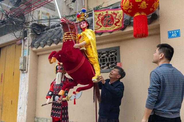 2月20日,广西宾阳县,80岁的周宏年(左)把自己制作的“木兰从军”游彩架人偶摆在家门口,供游客参观。游彩架是炮龙节的活动之一,数名孩童站在彩架台上,分别坐立于伞、扇、剑、弓、刀之类的小道具上,装扮成特定情景下的形象造型。江畅/摄