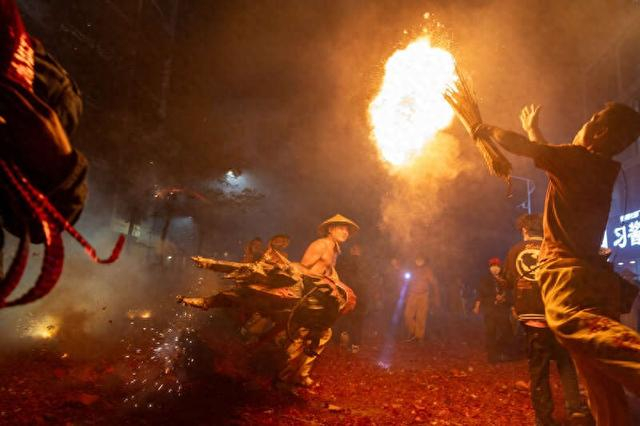 2月20日晚,广西壮族自治区南宁市宾阳县,炮龙经过街道时,火药师把火药抛向龙头,火药在空中绽放,当地群众认为火越旺,象征着来年福气越旺。江畅/摄