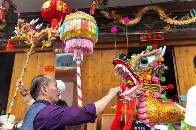 2月20日,广西宾阳县,非遗传承人、炮龙制作大师邹玉特在检查扎好的炮龙。他今年卖出了30多条炮龙。邹玉特平时会去学校开设炮龙制作兴趣班,还收了7个关门弟子,其中一个已经正式出师,他的手艺传承有了着落。江畅/摄