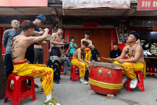 2月20日,广西宾阳县,几个年轻小伙正在敲锣打鼓。他们身上写着“龙”字,打出的鼓声铿锵有力,围观群众阵阵喝彩。他们轮流上场,不时还披上狮子头表演舞狮。江畅/摄