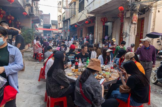 2月20日,广西宾阳县,几家人合作摆起“灯酒”,也叫“百家宴”。路过的人们可以随意参与其中,免费品尝丰盛的美食。每到正月十一,很多当地人会摆上这样的宴席,邀请大家一起庆祝炮龙节。江畅/摄