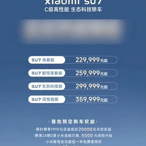 从爆料图来看,小米汽车SU7青春版为22.9万元起,SU7高性能版为35.9万元起。这一价格似乎也对应了此前的市场预测,小米汽车最终售价可能在25万至37万之间。