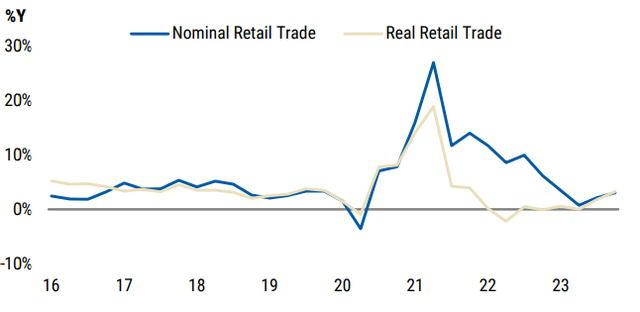 消费增长放缓的推动因素可能是劳动力市场降温,这给实际可支配收入造成压力,而利率上升则进一步给偿债成本带来压力,预计2024年第四季度零售同比增长2.2%,2024年四季度实际PCE同比增速将放缓至1.8%,2025年进一步降至1.3%。