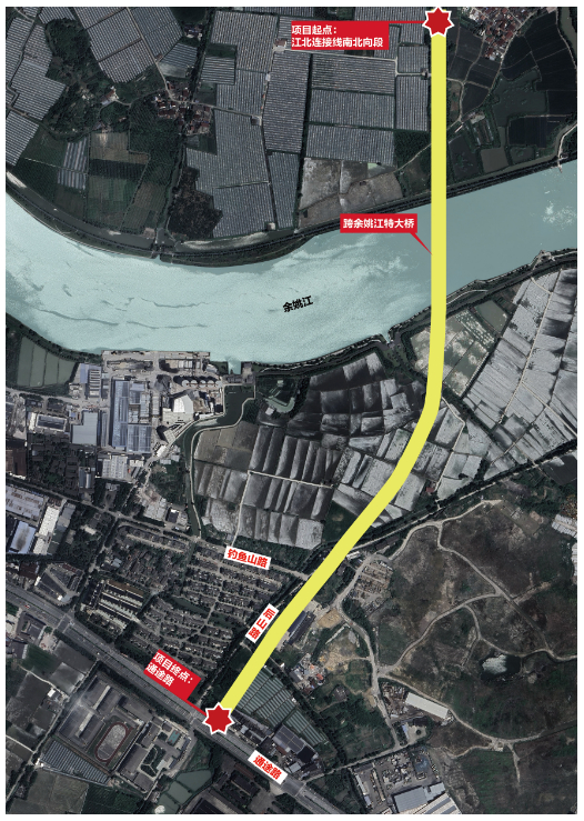 该项目北起现状江北连接线南北向段,跨越余姚江后,路线继续向南布设,终点止于通途路,路线全长约1.88公里。线路按一级公路双向六车道标准建设,设计速度80km/h,标准路幅宽度33米。