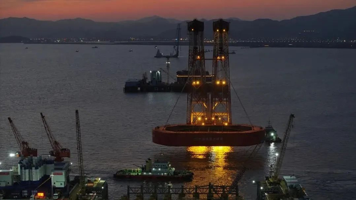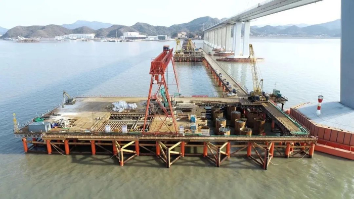 近日,在宁波市域铁路象山港跨海大桥施工现场,工人们在龙门吊、反循环钻机等设备的配合下进行主桥最后一根钻孔桩的钻进施工作业。