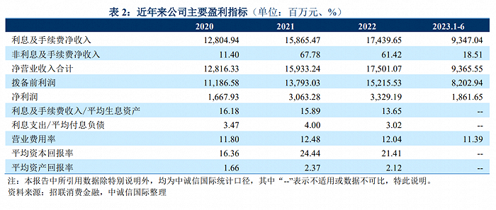 其他主要盈利指标方面,报告期内,招联金融实现利息及手续费净收入128亿元、158.6亿元、174.40亿元和93.5亿元,是招联金融的营收支柱。