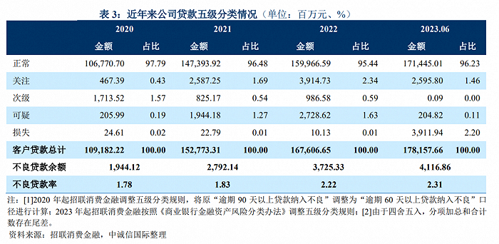 截至 2023 年 6 月末,该公司当年累计核销不良贷款 56.43 亿元,核销资产当年累计清收回款 4.77亿元。同期,招联金融逾期贷款为 66.89 亿元,占发放贷款和垫款总额的 3.75%,较上年末下降 0.26 个百分点。
