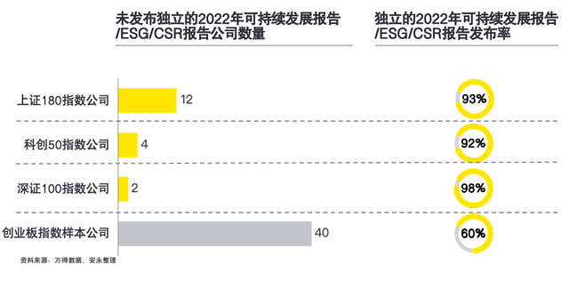 据最新的Wind数据统计情况显示,目前除创业板指数样本公司外,沪深两地的上市公司2022年度可持续发展/ESG/CSR报告发布率均达到90%及以上,得益于国内监管近几年对于可持续发展的大力推动,上市公司披露意识普遍较强。
