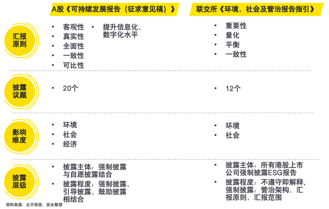 在《征求意见稿》未发布之前,A股上市公司年度可持续发展/ESG/企业社会责任(CSR)报告披露通常会参考港交所《ESG报告指引》。对比这两份披露指引,两者在汇报原则、披露议题、影响维度和披露层级方面存在如下差异。