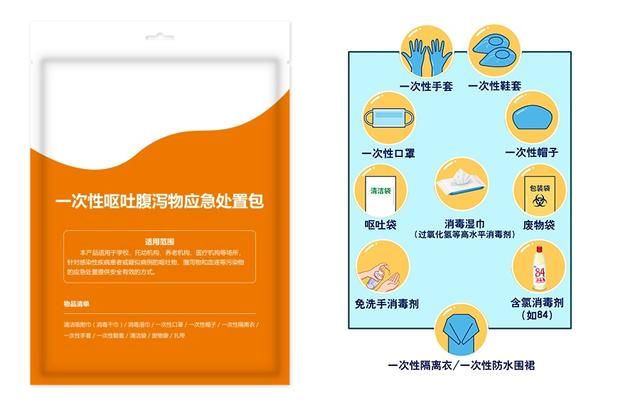 取出常用消毒物资,如果备有呕吐物应急处置包最好,如果没有,可使用消毒干巾、消毒湿巾、垃圾袋、免洗手消毒剂等物品。