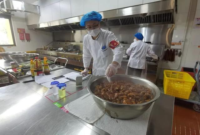 10时,闵行区君莲学校的后厨一派忙碌景象,厨师每烧制完一道菜肴,就把消过毒的电子温度计探针插进菜肴中心,确认温度符合标准,便送入分餐专间,6位师傅一字排开,流水线作业,以最快速度将饭菜盛入饭盒。