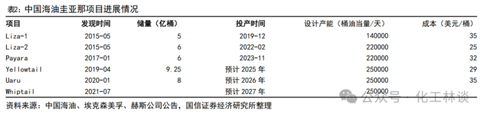 四期Yellowtail项目将在2025年投产,预期产能为25万桶/天,五期Uaru项目将于2026年投产,预期产能为25万桶/天,六期Whiptail项目埃尔森美孚已经于2023年10月份提交开发规划给圭亚那政府,预期产能为25万桶/天,预计到2027年总产量超过120万桶/天。