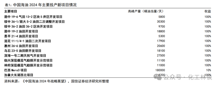 2024年公司新投产重点项目包括中国的绥中36-1/旅大5-2油田二次调整开发项目、渤中19-2油田开发项目、深海一号二期天然气开发项目、惠州26-6油田开发项目和神府深层煤层气勘探开发示范项目以及海外的巴西Mero3项目,合计高峰产量达到36.43万桶油当量/天(权益产量20.23万桶油当量/天)。
