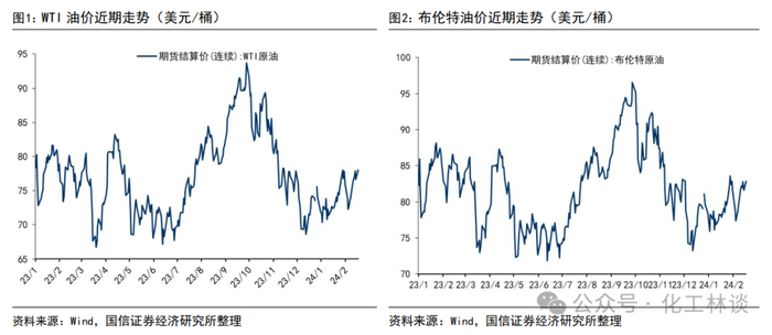 2月份原油价格上涨,一方面由于地缘局势升温;另一方面美国经济数据表现强劲,中国降准降息刺激经济提振原油需求,市场情绪较为乐观,我们认为原油整体供需偏紧,未来布伦特油价有望维持在80-90美元/桶的较高区间。