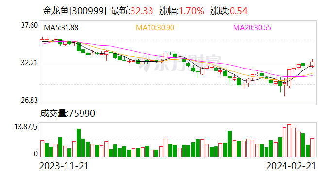 2月21日晚间,金龙鱼发布2023年度业绩快报。2023年,公司预计实现营业收入2515亿元,实现归母净利润28.5亿元。值得一提的是,2023年下半年,金龙鱼营收和净利环比双增,较上半年显著改善。