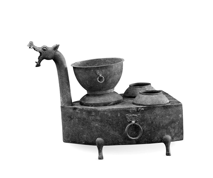 现藏于内蒙古博物院的汉代龙首青铜灶,是目前考古发现体量最大、级别最高的龙首青铜灶。灶的整体造型为龙头船形,主体由甑锅、釜、灶门和烟筒等组成,灶面附有三釜,一大二小,大釜上有甑。甑,是古代的蒸食用具,底部有许多透蒸气的孔格,置于鬲上蒸煮,如同现代的蒸锅。高耸的烟囱,在造型上采用了中华民族象征吉祥的龙形符号,功能上还具有吸风拔火、提高火力的作用,设计堪称精巧。这件龙首青铜灶具有典型的中原风格,却出土于长城以北的内蒙古呼和浩特地区,体现了秦汉统一多民族国家建立之下多民族杂居、游牧地区与农耕地区之间日常化、生活化的交融与互动。