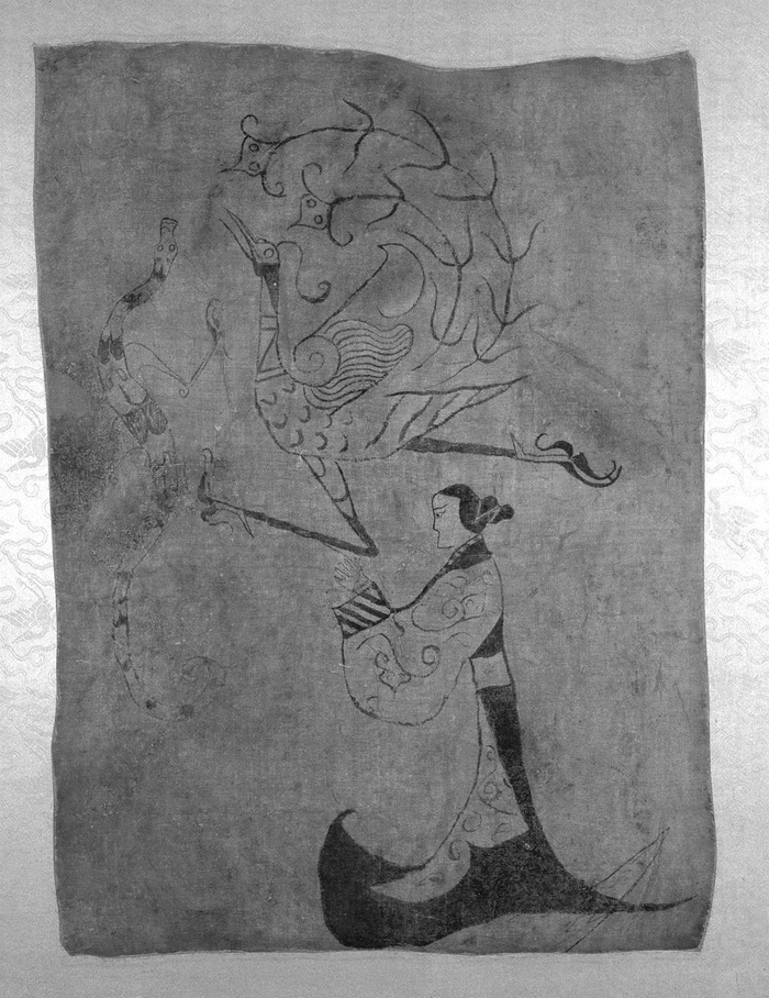 现藏于湖南省博物馆、出土于湖南长沙陈家大山楚墓的战国时期的《龙凤仕女图》帛画,纵31.2厘米、横23.2厘米。在这幅中国现存最古老的帛画上绘制了龙凤合体引导墓主人灵魂飞升的情景。一只振翅腾空、夭矫起舞的凤鸟,一条弯曲细长、扶摇直上的神龙……说明此时楚国不仅从一个偏安丹阳之隅、不足百里的蕞尔小国,发展壮大为问鼎中原、饮马黄河的战国七雄之一,其文化信仰中除了楚人崇拜神圣凤鸟外,也开始融入华夏龙的意象。这件帛画见证了战国时期楚人凤文化与华夏龙文化的深度融合与创新,展现了先秦时期楚人为中华民族形成发展所作出的巨大历史贡献。