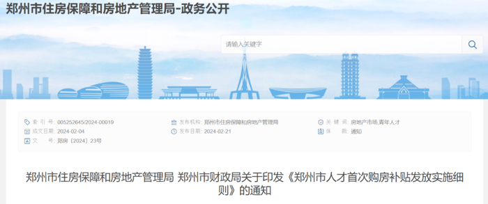 2月21日,郑州市住房保障和房地产管理局、郑州市财政局联合发布《郑州市人才首次购房补贴发放实施细则》。