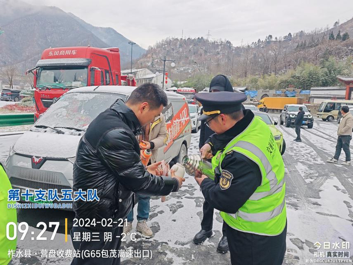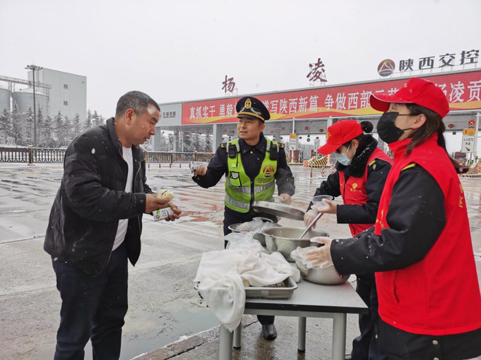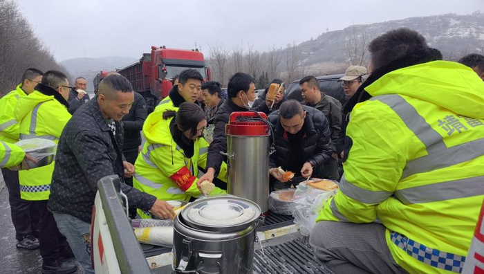 西略分公司所辖各站组织人员为司乘提供馒头、鸡蛋、豆奶、方便面、热水等简餐,并对滞留车辆做好解释工作,安抚司乘焦躁情绪,让司乘在寒潮天气里感受到陕西交控人的温暖与关心。(西略分公司)
