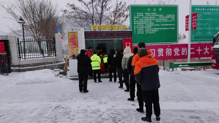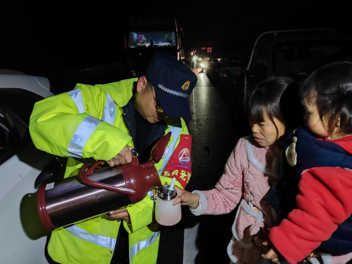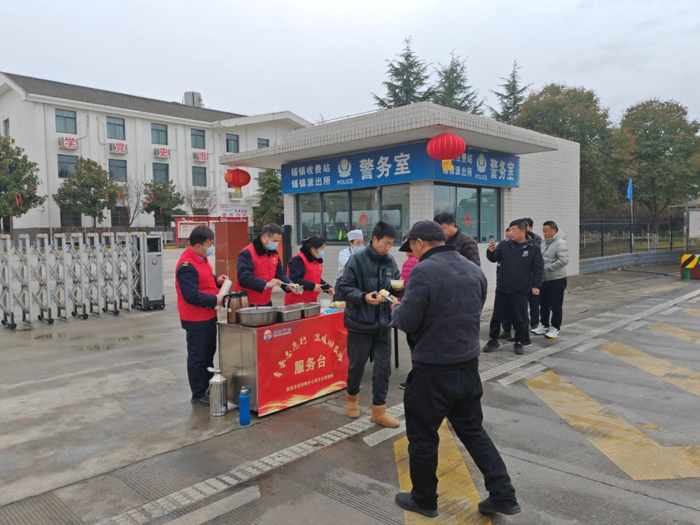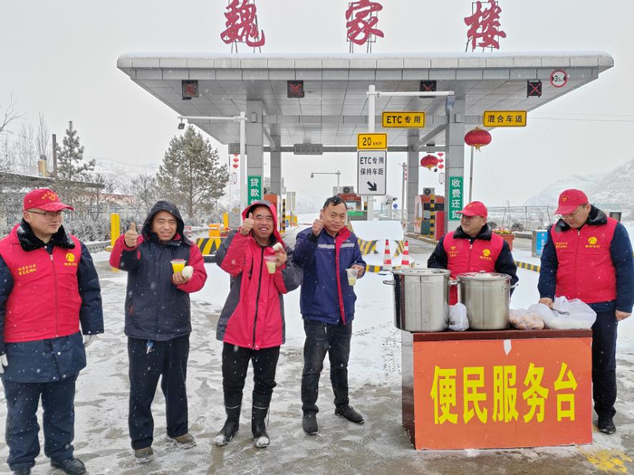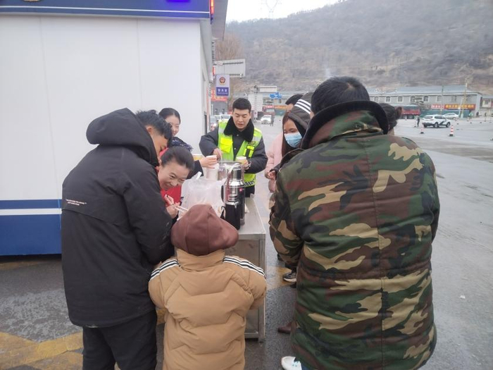 西富分公司辖区各收费站志愿服务小分队为滞留司乘提供热水、饭菜等,并与司乘亲切交谈,耐心解答道路实时情况。(朱颜)
