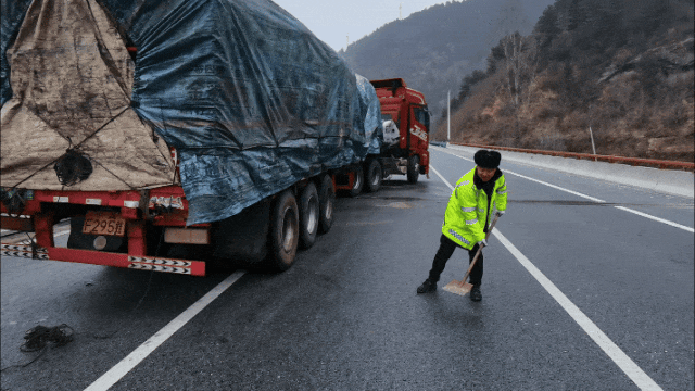 银昆高速宝鸡至凤县段路面结冰易滑,货车突然失去动力无法行驶,宝鸡分公司宝坪管理所组织人员力量在路面挥锨撒沙、疏导交通。(邓岩)