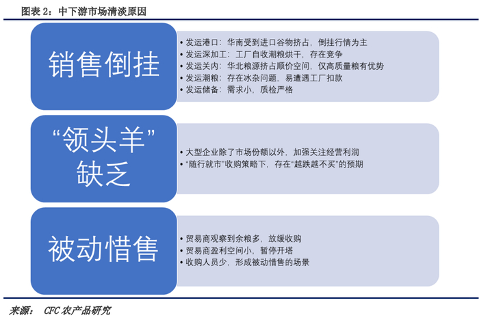 在节前报告中我们结合调研结果给出了对于粮食销售进度的评估,我们认为在1月中旬之前,黑、吉地区的售粮进度同比偏慢3-5成,且西部压力大于东部压力。这一点从种植成本角度出发也可以理解,具体来说黑龙江东部地区由于地租水平低于西部地区,且单产水平并未受到夏季偏旱和上市前的降水偏多的影响,所以粮食的流通成本较西部偏低,这意味着在落价过程中,东部农民相较于大幅亏损,更多是成本上升后收益较去年的下降,情绪上表现更多为不解和愤怒,并未进入到大幅亏损之后的绝望和“暂时离场”,所以也能看到调研过程中选择年前销售的种植主体多于西部反映的情况,而此前我们对于基本面的估值低点更多来自于低成本地区,所以伴随基本面低估值地区逐渐售出后,基本面的支撑削弱,更多是基于种植端在节后“越跌越卖”的“踩踏”冲击,意味着价格的下移幅度难以估测,只能依靠中下游基于收购情况所形成的量价关系来反映。而且从预期面来看,年后卖压一事已经成为市场普遍认同的点,从此前05合约给到的2317折算产地收购价格已经来到0.76-0.77元/斤的水平,意味着对于节后落价的预期已经被部分price-in。需要进一步评估的是中下游群体的收购可能。