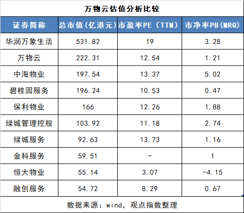 尽管如此,万物云仍是总市值仅次于华润万象生活的港股物管企业,目前市值在222亿港元左右,对应市盈率12.54倍,低于华润万象生活(19倍)、中海物业(13.37倍)。