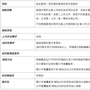 根据恒生指数公司发布的编算方法,恒生综合指数主要对流动性设置门槛,要求候选的股票每个月换手率为0.05%或以上;挑选时,根据最近12个月月均市值由大到小排列,并计算每只股的累计市值覆盖率,覆盖率在前95%以内就会被选为成份股。