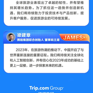 “2023年,在旅游热潮的推动下,中国开启了与世界重新连接的重要征程。得益于我们不断扩大的市场影响力,我们的国际业务取得了显著增长。”携程集团联合创始人、董事局主席梁建章表示,“我们将持续关注全球化和人工智能创新,并有信心在2023年成功的基础上更上一层楼,进一步探索未来的机遇。”