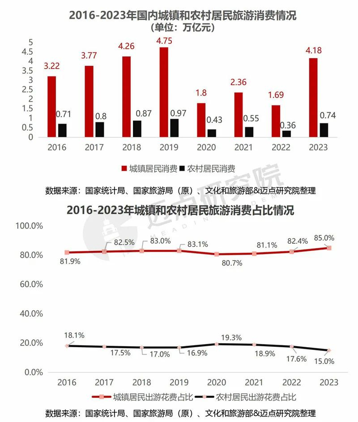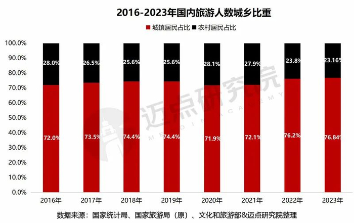 从城乡和农村居民旅游消费看,2023年城镇居民旅游消费4.18万亿元,同比增长147.5%,占国内旅游总收入的85%;农村居民出游消费0.74万亿元,同比增长106.4%,占旅游总收入的15%。从2016年至2023年的旅游消费数据可知,城镇居民旅游消费持续占据主导地位,城镇居民与农村居民旅游消费的差距较大,除出游人数基数差异外,还与城镇居民人均可支配收入远超农村居民人均可支配收入密切相关(2023年全国城镇居民人均可支配收入51821元,农村居民人均可支配收入21691元,二者相差30130元)。