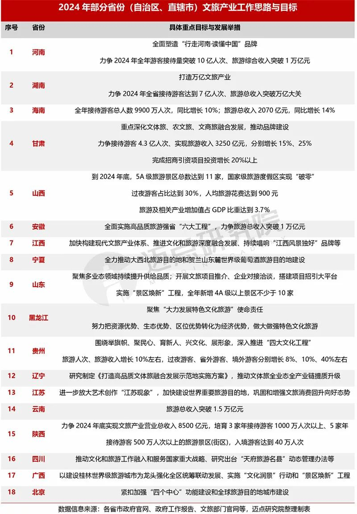 目前,全国各省市相继召开地方“两会”、文化和旅游工作会议,公布2023全年旅游“成绩单”,同时制定2024年文旅工作目标、部署2024年文旅工作任务。