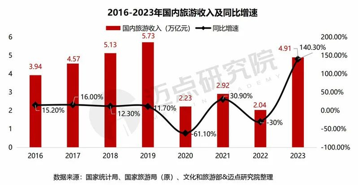 2023年旅游行业强势复苏的一年,被压抑三年的出游需求得以释放,旅游逐步成为人们的一种生活方式,掀起国民出游新热潮。据文化和旅游部统计,2023年,国内出游人次48.91亿,比上年同期增加23.61亿,同比增长93.3%,涨幅明显,恢复至2019年(60.1亿人次)的81.38%,国内旅游市场复苏加速。