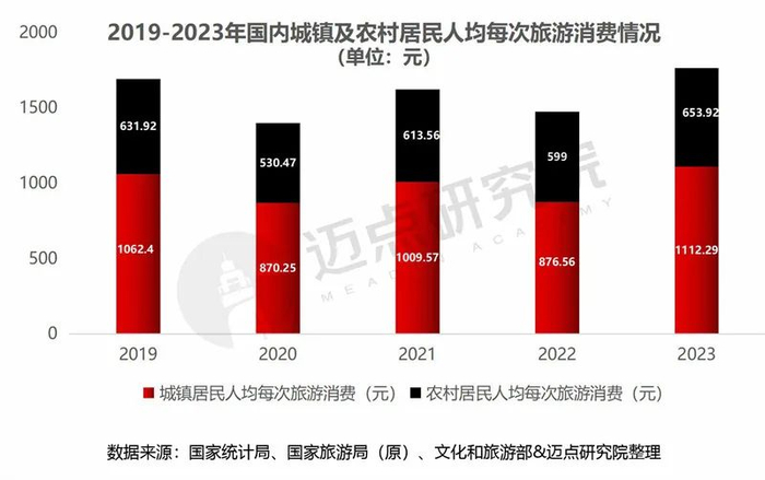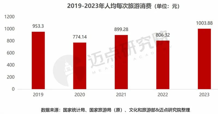 2023年人均每次旅游消费1003.88元,比上年同期增加197.56元,同比增长24.5%。其中城镇居民人均每次旅游消费1112.29元,同比增长26.89%;农村居民人均每次旅游消费653.92元,同比增长9.17%,城镇同比增幅高于农村。对比2019年至2023年数据可知:2023年国内人均每次旅游消费达千元,超越疫情前的2019年,为近五年来最高。