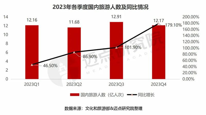 从各季度国内旅游接待人数情况来看,第三季度为传统旅游旺季,受暑期旅游热利好驱动,国内旅游人数最高(具体为12.91亿人次);第一季度和第四季度基本持平,均超12亿人次;第二季度最低。全年来看,在文旅市场供需两旺的背景下,各季度之间的差异缩小,呈现“淡季不淡,旺季更旺”特征。与2022年相比,各季度国内旅游人次均有所增长,且呈现逐季递增态势,四季度增长显著,增幅高达约1.8倍。