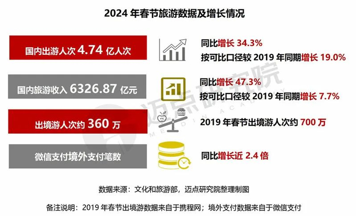 2024年春节假期文旅市场供需两旺,实现“开门红”。综合文旅部、各省市文旅部门、主要旅游平台公布、微信境外支付平台等数据,国内游、出境游、入境游订单等指标同比均大幅增长,部分数据甚至超过2019年同期水平。如春节国内旅游出游4.74亿人次,同比增长34.3%,按可比口径较2019年同期增长19.0%;国内游客出游总花费6326.87亿元,同比增长47.3%,按可比口径较2019年同期增长7.7%。2024年春节文旅市场呈现一番“热辣滚烫”的喜人景象,全年来看有望延续火热态势、高景气或将贯穿整年。