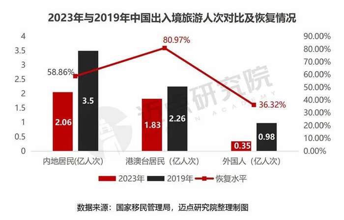 从2023年入境游发展特点看,入境旅游市场恢复表现出不均衡特征,港澳台市场的恢复显著快于外国人市场。依据国家移民管理局数据计算对比,2023年,港澳台居民出入境人次恢复到2019年的81%,而外国人出入境人次只恢复到36%。