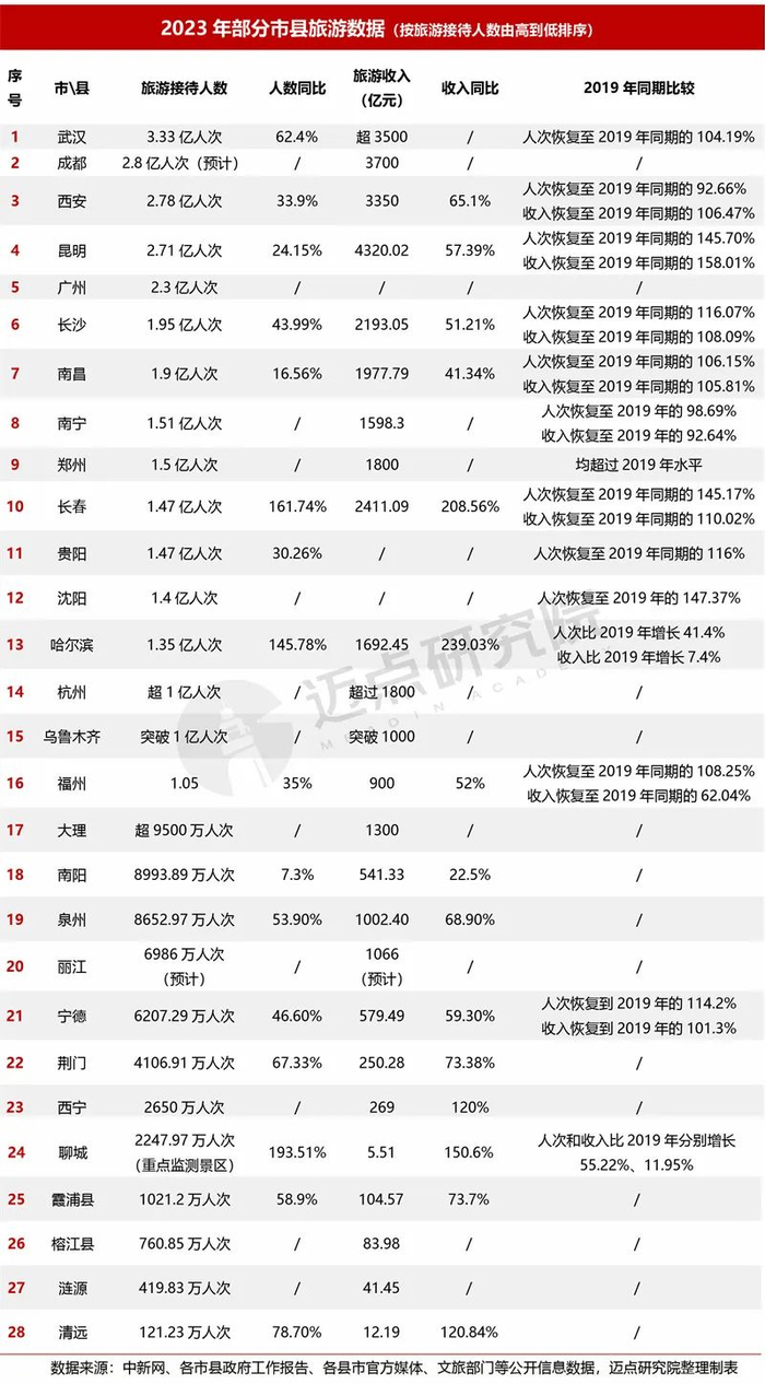哈尔滨市:2023年度,按常规口径监测,哈尔滨市共接待游客1.35亿人次,同比增长145.78%,比2019年增长41.4%。全市实现旅游总收入1692.45亿元,同比增长239.03%,比2019年增长7.4%。可见,冰雪旅游带火哈尔滨,其全年旅游人次和收入均超越2019年。