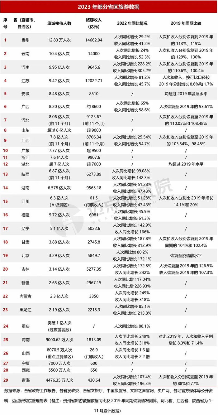 具体比较29个省(直辖市、自治区)旅游数据,贵州省接待游客12.83亿人次 、旅游总收入达1.47万亿元,两项指标均位列各省之首,“人财两旺”。2023年贵州全省接待旅游人次、旅游总收入、游客人均花费分别恢复到2019年的113%、119%和105%,旅游业呈现出强劲的增长势头。值得一提的是,2023年榕江“村BA”、“村超”为贵州带来全新的旅游产业化“赛道”,为“赛事带动文旅体融合、促进乡村振兴发展”的优秀案例,值得其他地方借鉴学习。