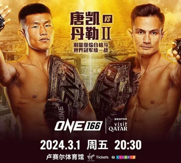 3月1日,ONE冠军赛将在卡塔尔卢赛尔体育馆举办ONE 166,中国首位男子综合格斗世界冠军“水深哥”唐凯时隔一年半再度登台,他将在当天的羽量级世界冠军统一战中与羽量级临时世界冠军丹勒上演二番战。