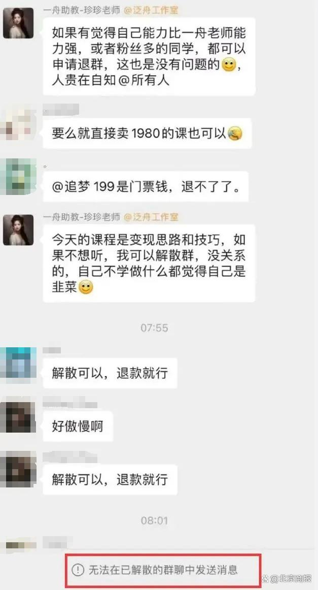 另外,买了李一舟课程的周先生对媒体表示:去年11月份,他在视频平台看到李一舟的直播后,冲着“清华博士”的头衔下了单。结果到第二个月,周先生发现视频里的大部分内容和他在B站上看的一样。当他和其他学员一样向助理反馈课程太水,提出退费申请时,对方没了任何反应,“平时大部分时间问他们,基本也没回复,仅有的回复也不专业”。不过这两天,李一舟的助理们纷纷现身,对提出质疑的学员采取强硬态度,甚至直接踢出群。