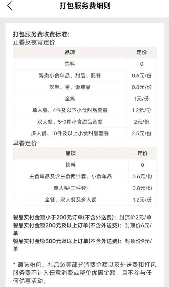 根据肯德基公布的打包服务费收费规定,我们可以看到正餐和夜宵的费用构成为:饮料不收取打包费;鸡类小食、甜品和配餐每份0.6元;汉堡、卷、饭类每份0.8元;全鸡每份1元;单人餐、4件及以下小食甜品套餐每份1.2元;双人餐、5-9件小食甜品套餐每份2元;多人餐、10件及以上小食甜品套餐每份2.5元。早餐的定价为:饮料打包费为0元;主食单品和小食单品每份0.6元;单人餐每份0.8元;全餐、双人餐和多人餐每份1.2元。此外,餐品实付金额小于200元的订单,打包费封顶价为2元;实付200元及以上的,打包费封顶价为6元;实付300元及以上的,打包费封顶价为9元(不含外送费)。