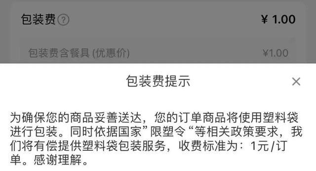 今年1月1日起,盒马对线上订单收取1元包装费。对此,盒马称,“为确保您的商品妥善送达,我们将使用塑料袋等环保包材对商品进行包装。同时依据国家‘限塑令’等相关政策要求,我们将对包装材料适当收费,收费标准为:1元/订单。”