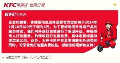 肯德基还表示,打包服务费只适用于肯德基宅急送自有渠道和三方渠道,大神卡用户将享受外送费减免,同时将免除打包服务费。