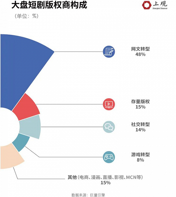 由上观新闻统计的数据显示,有接近一半的短剧源于网文转型,这些热销网文本身便自带“爽感”元素,要么是偶遇霸道总裁爱上我、受欺负赘婿逆袭翻身、欠债千万穿越回古代做皇上,或是爱情甜剧、虐恋等。