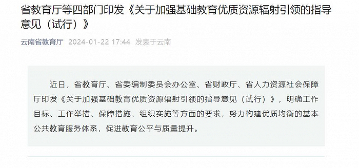 1月22日,省教育厅等4部门联合发布《关于加强基础教育优质资源辐射引领的指导意见(试行)》。文件中强调,要推进集团化办学,由优质学校牵头,优先把相对薄弱学校、新建学校纳入教育集团。