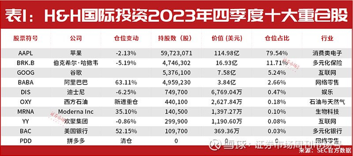 据H&H国际投资2月14日披露的持仓报告显示,截至2023年年末,其持仓美股股票总市值近145 亿美元(人民币超过千亿元)。从具体持仓个股来看,第一的重仓股为苹果,持仓114.98亿美元,仓位占比高达近80%,此外,持仓伯克希尔·哈撒韦的市值同样较高,接近17亿美元,仓位占比为11.71%。此外,其还持仓谷歌、阿里巴巴、迪士尼等公司(见表1)。