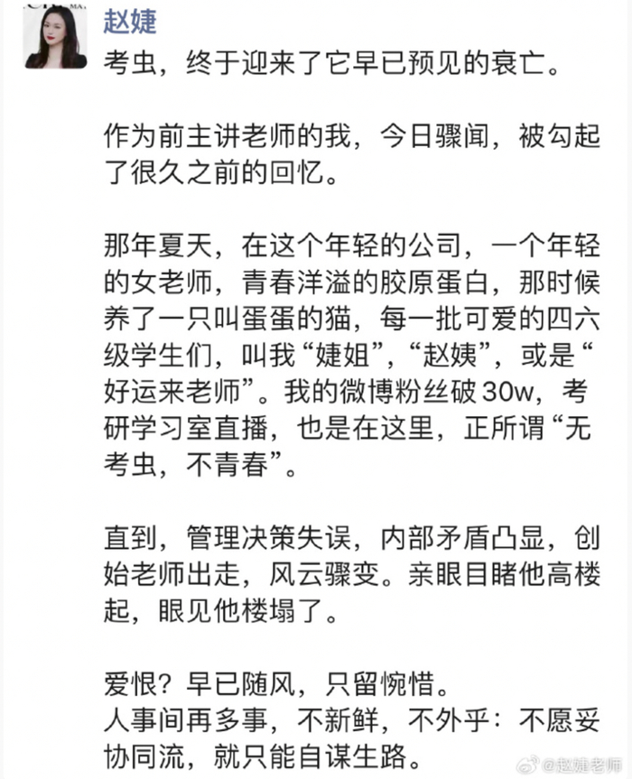 2月21日,考虫考研英语老师罗文婷在微博发文,本来七点要给大家准时上课的,我也是今天突然接到课程变动的消息,考虫陪伴了大家七年的时间,很遗憾今年不能全程守护大家的备考之路了。