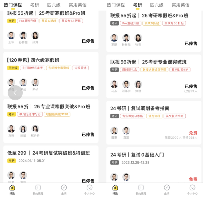记者在考虫app发现,目前考虫官网的课程都变成已停售,只有免费课程还能继续参加。